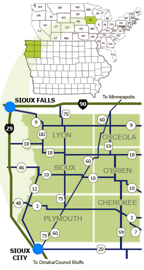 We are also within close proximity to I-80, I-90, and I-29 and the new Highway 60 Expressway from Sioux City to Minneapolis has recently been opened.