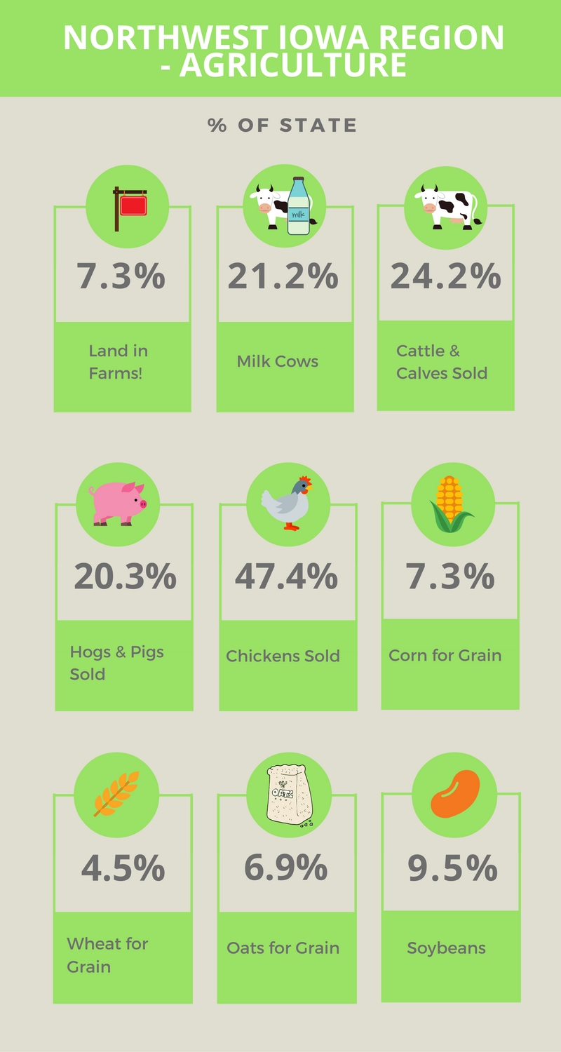 According to the 2007 Census of Agriculture, there are nearly 6,700 farms in the six counties in Northwest Iowa, and these farms have a combined total of 2.2 millioacres. Our Region accounts for just over 7% of the farms and farmland in the State of Iowa, and it is a leading producer of agricultural commodities.