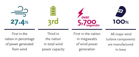 Iowa leads the nation in wind power generation as a percentage of total power output at 27.4%. The State ranks first in wind power generation (over 5,700 megawatts) and also ranks third in wind power generation capacity. A robust supply chain has been developed , which includes the manufacturing of all major wind components. Northwest Iowa is a leading wind energy region in the state.